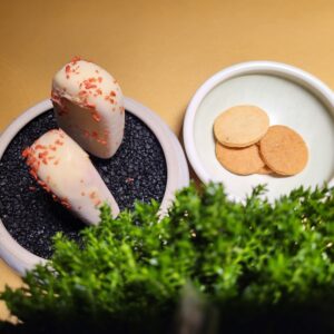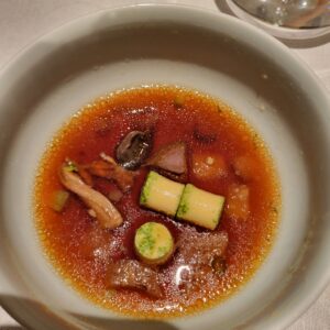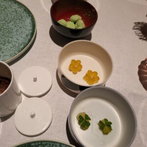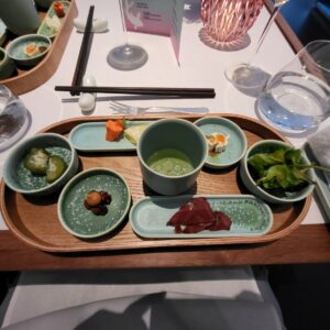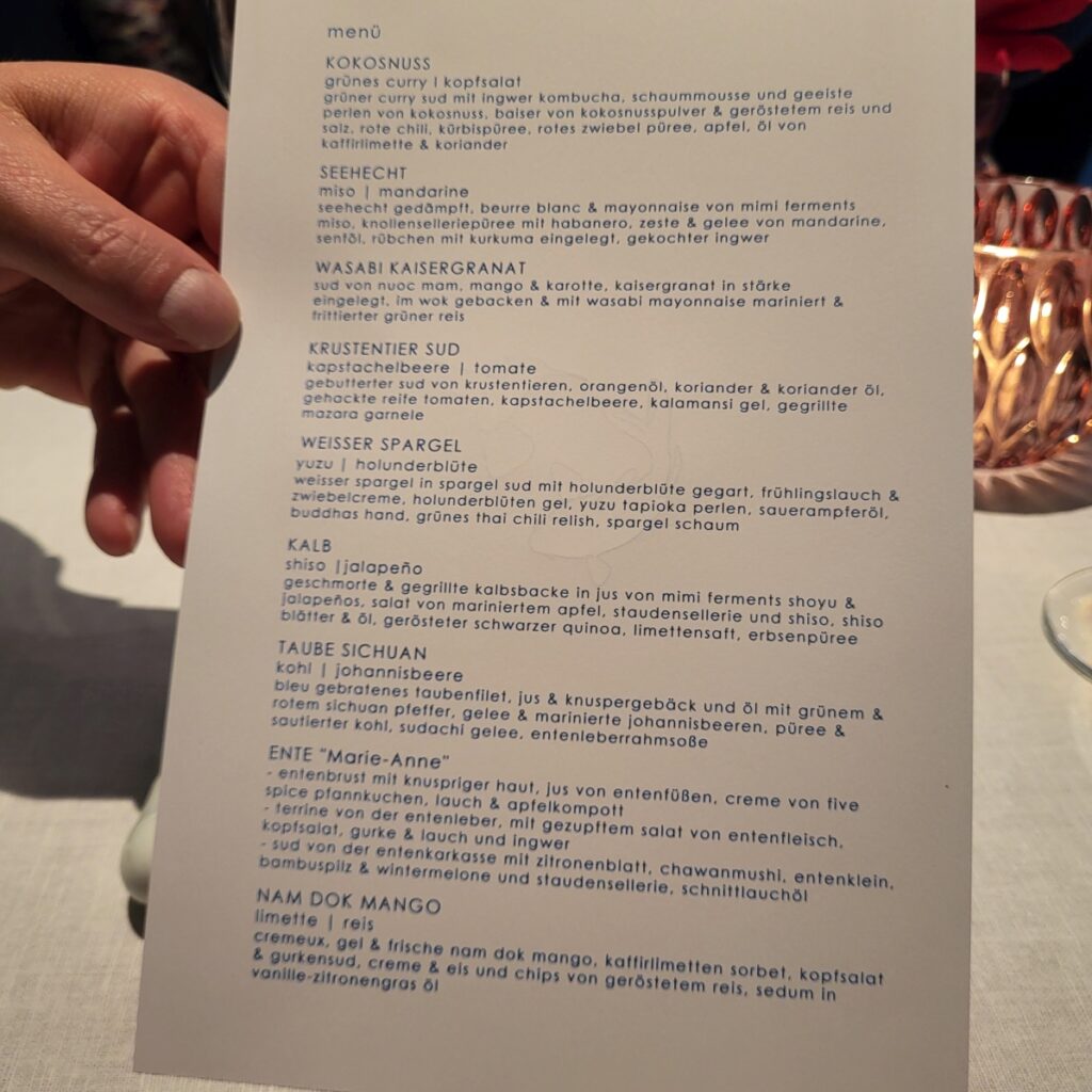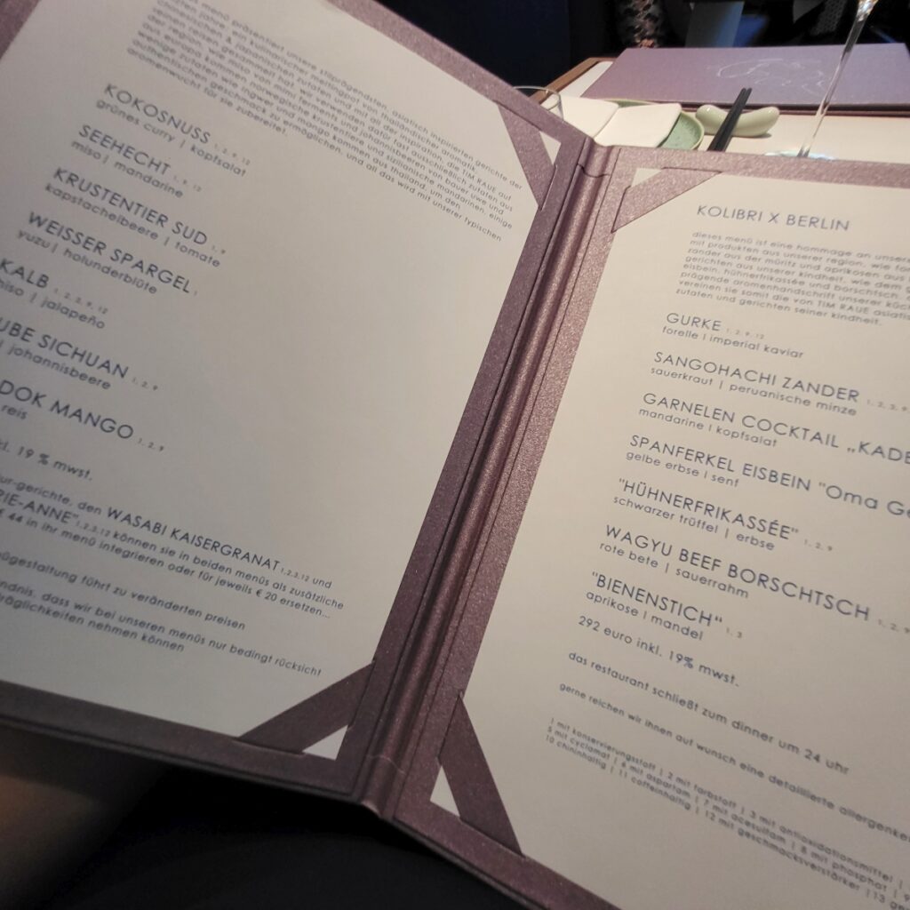 Drei Menüs standen zur Auswahl, Kolibri x Berlin, Koi und ein veganes MenüWir entschieden uns für das Menü „Koi“ und hatten als mögliche Upgrades noch die Signature Dishes (Wasabi Kaisergranat sowie Ente „Marie-Anne“) gewählt.