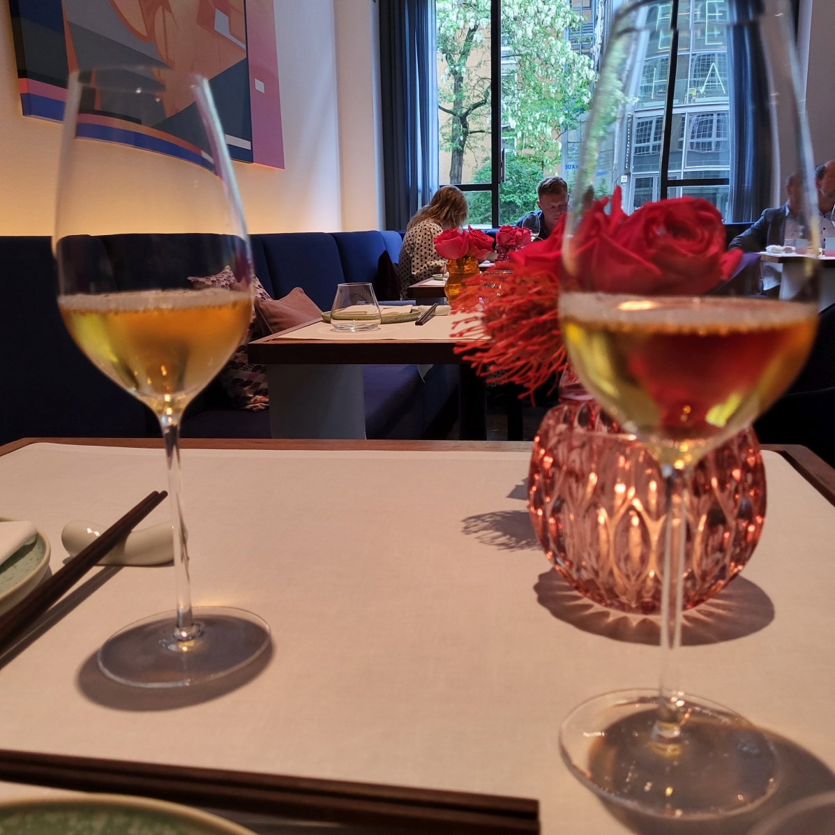 Liegt jetzt nicht sonderlich spektakulär. Interieur ist zu dem Zeitpunkt hell, modern elegant mit blau als vorherrschender Farbe. Hohe Decken, gut ausgeleuchtet, in Summe eher schlicht.